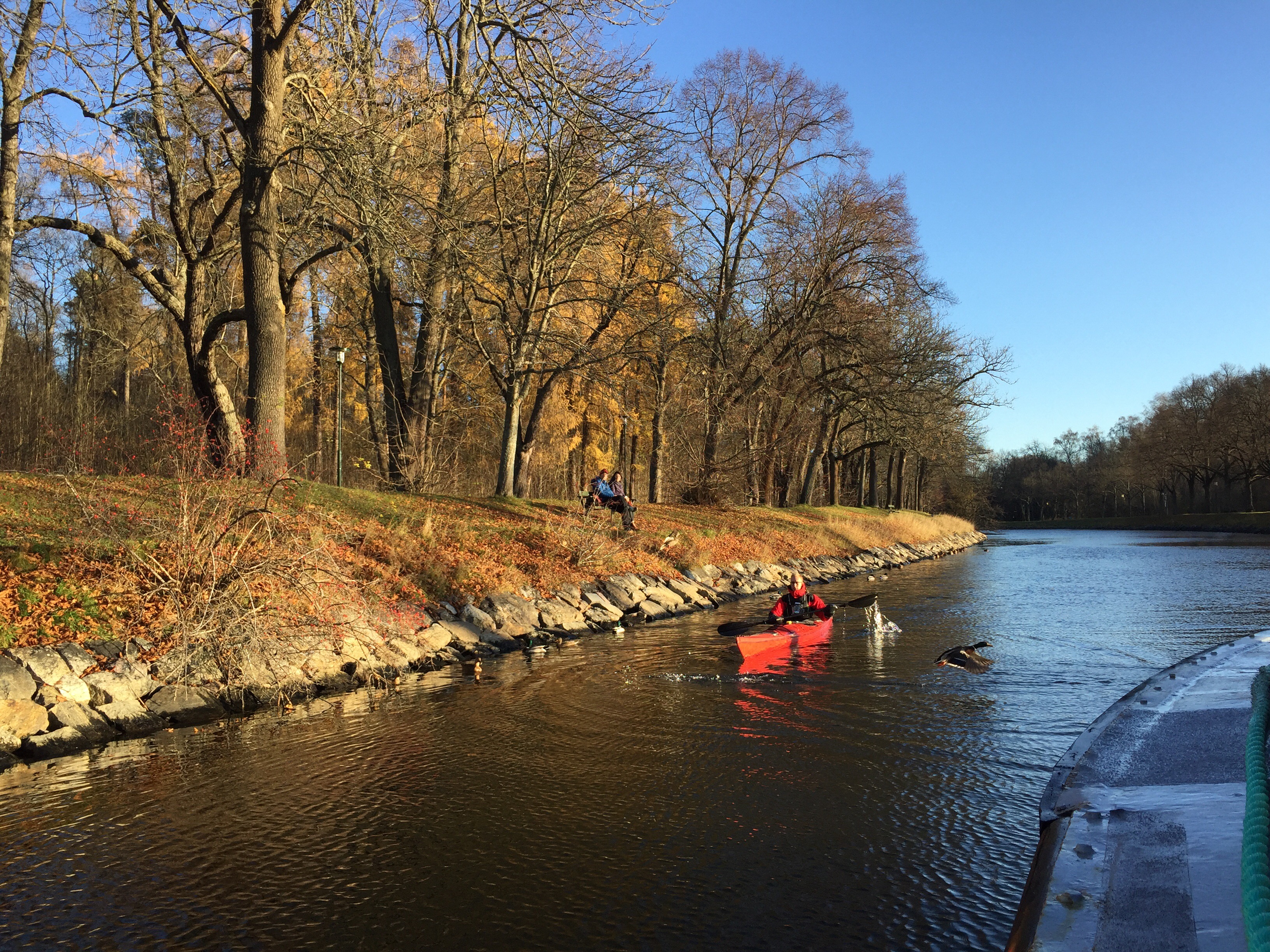 Frisch verliebt © Sandra GrüningTausend Jahre alt ist diese Stadt und hat kein bisschen Alterserscheinungen. Wow! Neid. Sie muss mir unbedingt verraten, wie sie das macht. Und dieses viele Wasser, Wasser, Wasser – Stockholm besteht nur aus Wasser. Und ein paar wunderschönen Häusern, Palästen und Parks. Ich bin verliebt auf den ersten Blick. Wasser gehört für mich zum Glücklichsein unbedingt dazu. Wie die Luft zum Atmen. Ich weiß, wovon ich schreibe. Ich habe 14 Jahre auf Wasser verzichtet. Und da ist noch etwas, was mir sehr gefällt. Wir schippern keine zehn Minuten und sind mitten im Grünen. Oder besser: In der entlaubten Natur. Inklusive Tiergeschnatter.