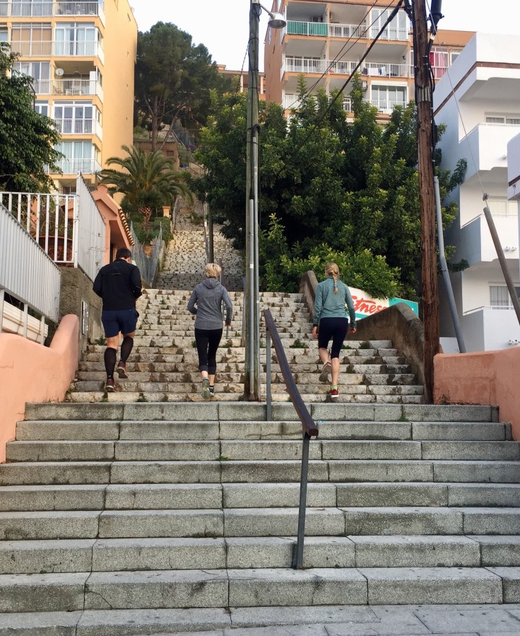 Dafür lacht die Sonne aus einem frostig kalten Himmel auf uns Frühaufsteher herab. Augen zu und durch, sage ich mir. Der Strand ruft. Die Übungen haben’s heute in sich. Hu! Ha! He! Und das in der richtigen Reihenfolge ist vor dem Frühstück die erste Höchstleistung fürs Hirn. Den motivierten Treppensteigern schaue ich dann doch lieber zu. Denn auf meine Beine warten heute noch neue Kilometer Freudentanz rund um Santa Ponça. Wie heißt es so schön? Nur die Harten kommen in Santa Ponça in den Garten.