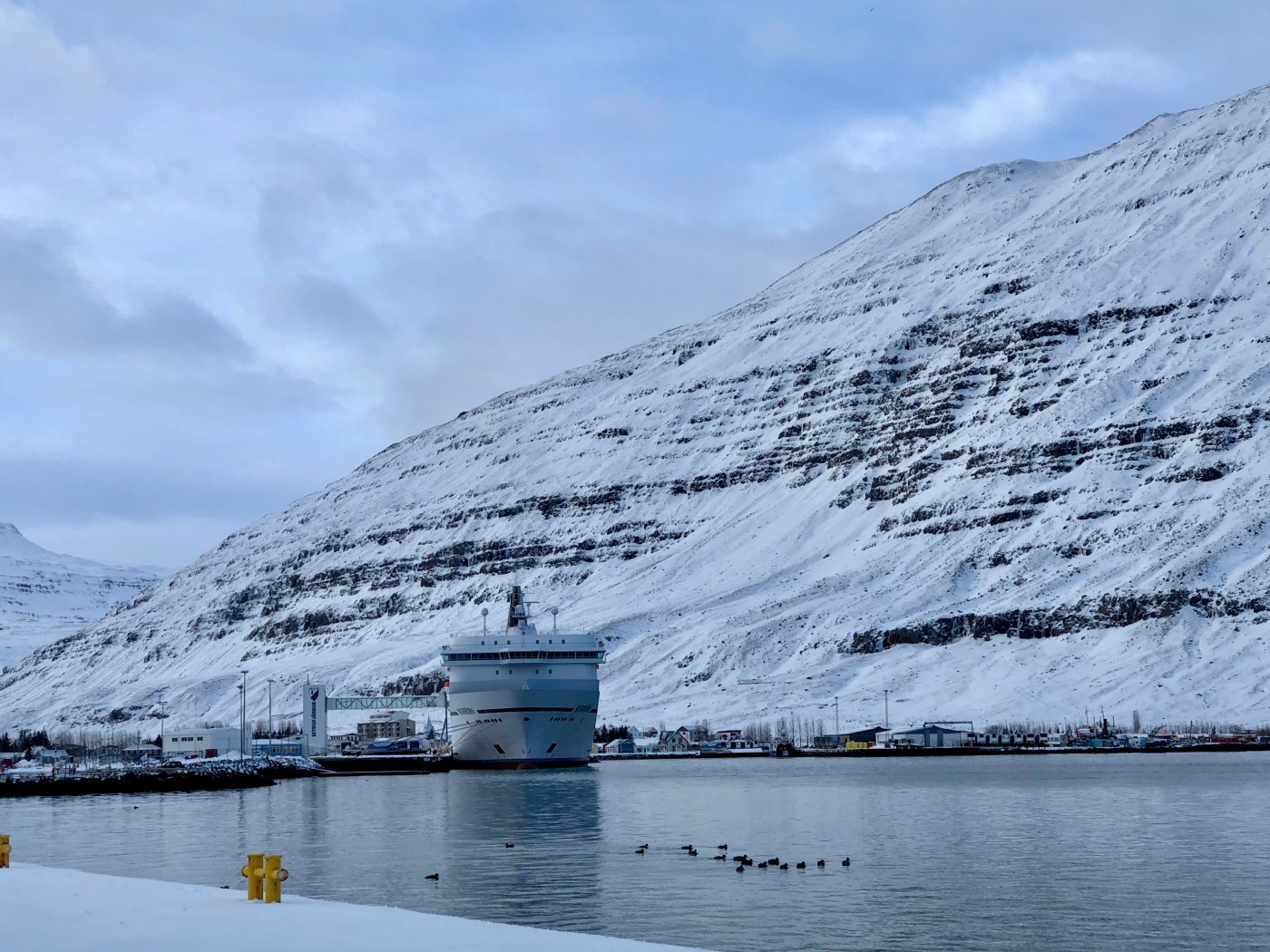 Heute ist definitiv Skihosenwetter. Es ist eisig. Minus acht Grad zeigt das Thermometer an. Die Einfahrt in den Fjord von Seyðisfjörður ist atemberaubend. Pünktlich zur blauen Stunde passieren wir die majestätischen Felswände. Die Atmosphäre, die sich bei der BBC-Serie „Trapped – Gefangen in Island“, die wir hier jeden Abend schauen und die in Seyðisfjörður spielt, unter die Haut schleicht, schleicht sich auch in diesen Morgen. Mystisch und ein bisschen gruselig ist es. Das Schneetreiben lässt die Felsmassen fast unwirklich erscheinen. Ich stehe einmal mehr gebannt an Deck und staune. Doch dann erscheinen die Lichter der kleinen Stadt am Ende der Welt. Heimelig und warm begrüßen sie uns.